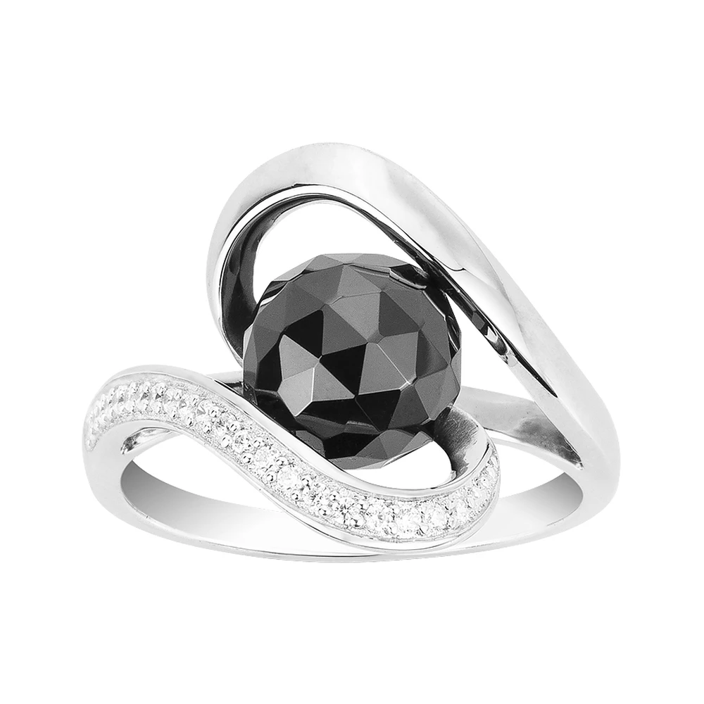 Bague Argent Rhodié 925/1000 Boule Facetée Céramique Noire et Pavage Oxydes