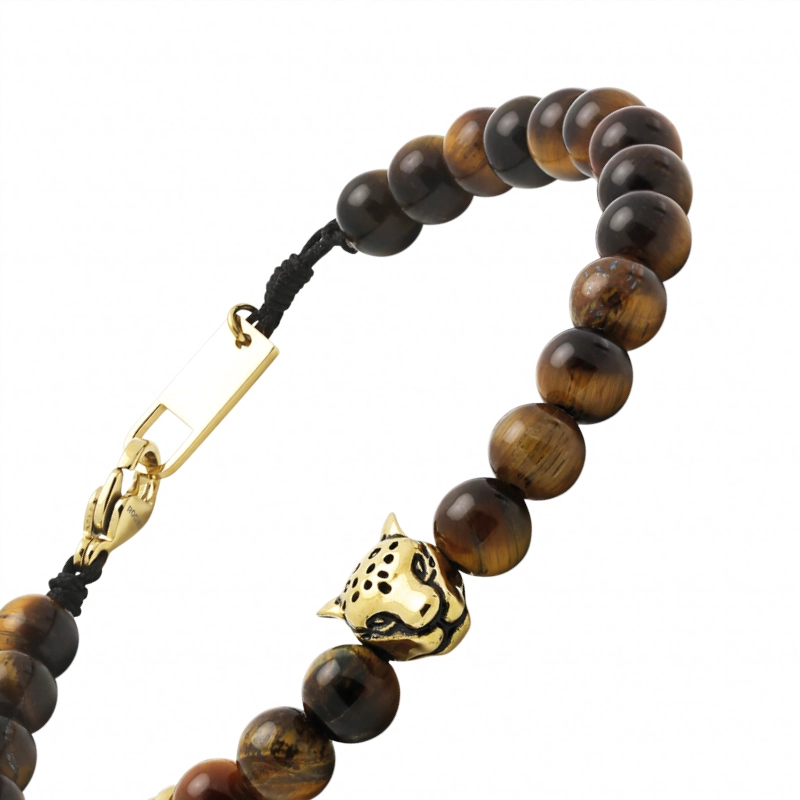 Bracelet Homme Rochet Talisman 6mm Tête de Tigre Acier Pvd Jaune et Perles Oeil de Tigre HB57686