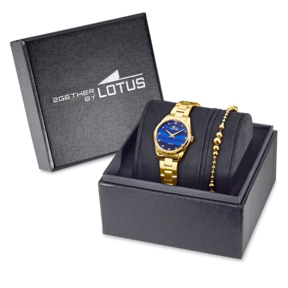 Coffret Montre et Bijou Lotus Femme Acier Doré Fond Bleu Bracelet Acier Doré 19007/2